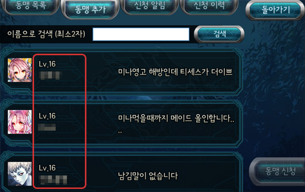 - 버튼을 터치해서 동맹 메뉴로 들어가 동맹을 추가할 수 있습니다. 아무 이름도 검색하지 않으면, 무작위로 검색해 다른 리바이어선을 보여줍니다.
