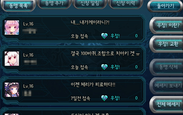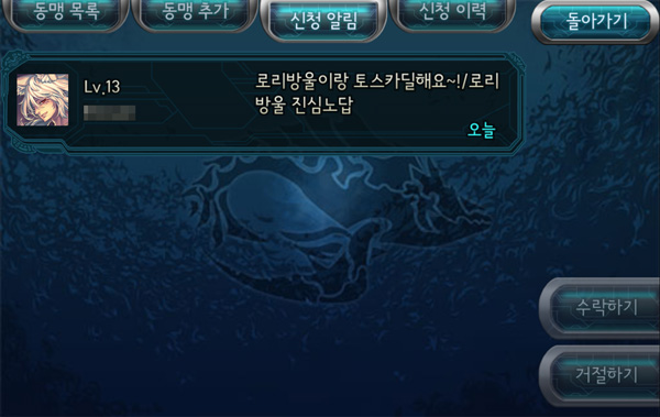 - 이 목록에서 동맹을 신청하면, 동맹 신청을 받은 쪽의 화면에 동맹신청 알림이 표시됩니다.