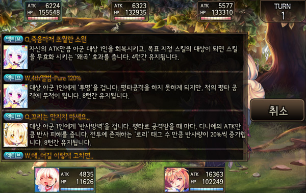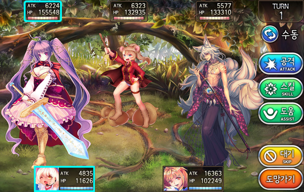 - 파티 편집에서 저장한 파티를 이용하여 공격, 스킬, 도움(어시스트)을 통해 전투를 진행하게 됩니다.