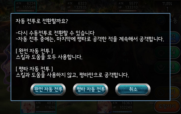 - 화면 우측 상단의 수동을 터치하면, 자동 전투와 수동 전투를 설정할 수 있습니다.
