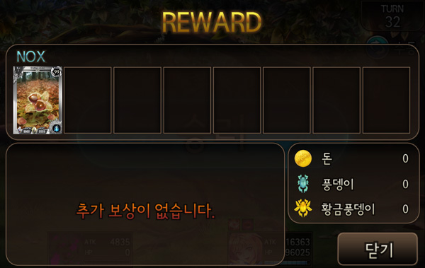 - 전투에 승리하게 되면 보상으로 녹스와 돈, 풍뎅이를 랜덤으로 얻을 수 있습니다.